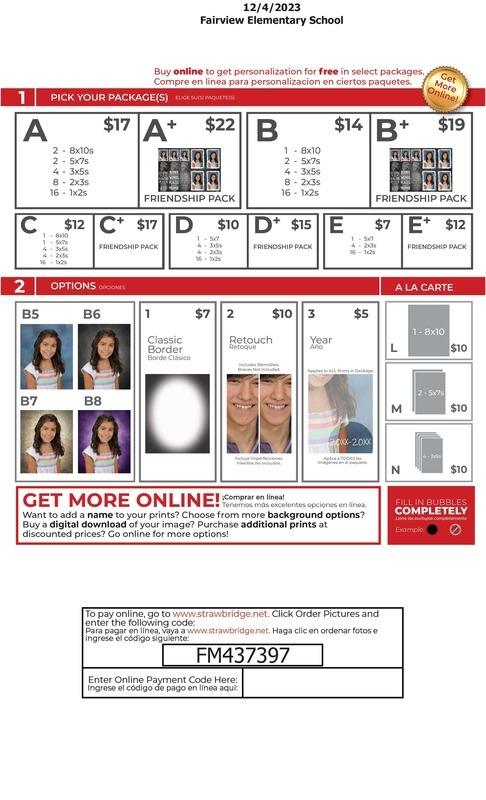 Strawbridge has provided this link to allow allow parents to sign-up to receive updates via email regarding your child's school portraits: https://strawbridge.fotomerchanthv.com/clients/fairview-elementary-school-1/fall-retake-pictures-12-4-2023-29/optIn. When entering student information, please be sure to enter the student's name as it is on file at the school.